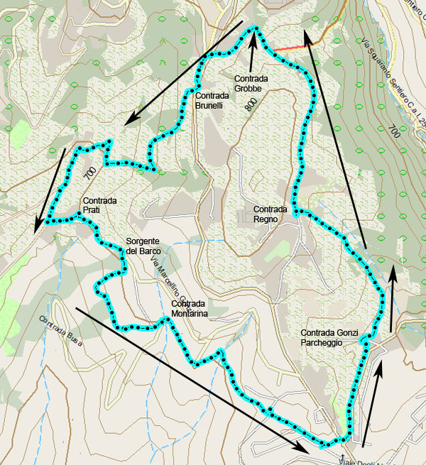 Giro delle Contrade - Contrade Gonzi - Regno - Grobbe - Brunelli - Prati - Sorgente del Barco - Montarina - Torcolo